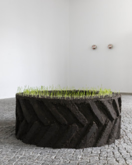 Soil sculpture representing the front tractor tire of the family farm in which fodder cereal seeds were planted. As the plants grow, the sculpture is altered or even partially destroyed. The use of peasant (heritage) seeds revokes the idea of an intensive agricultural production model and a standardization of forms and tastes.