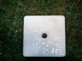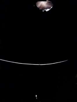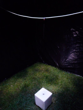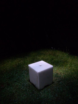 She installed a black parallelepiped made with this cover. This strange place, made sacred by the solemnity which imposes a foreign, improper and monolithic presence, reveals inside a device close to that of the alchemist: a drip drops regularly some milk on a simple salt stone.The stone with its pure whiteness is smoothly, slowly affected. Decomposing materiality. Nothing spectacular, just a natural process shown in an artificial way, contrasts between whites and blacks, between human order geometry and nature’s random, between the appearance and the unveiled.